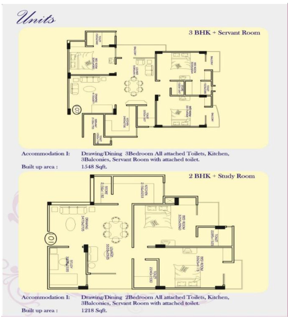 - 2BHK+ Study Room @ 1218 Sq.Ft. , 3 BHK @ 1500 Sq.Ft. & 3BHK+ Servent Room @ 1548 Sq.Ft.