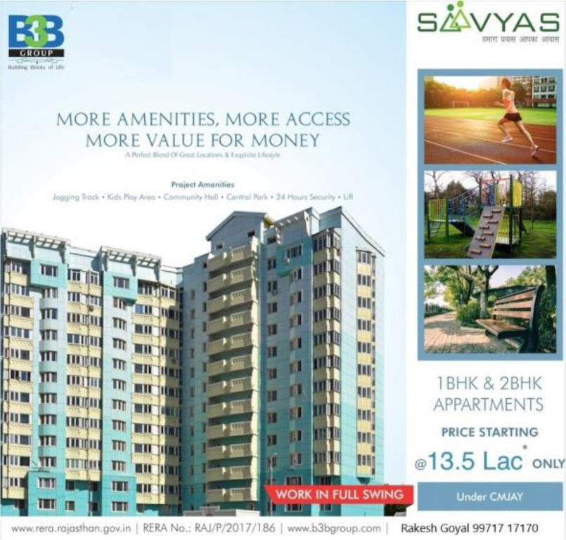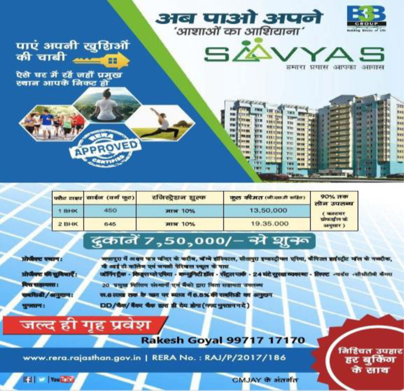 ‘Saavyas’ By SKG B3B LLP At Jagatpura Jaipur Has Offers Residential Units With Top Class Specifications That Meet The Expectations Of The Lifestyle Of The Urban Population. The Project Is Located At Jagatpura, Which Is Close To The Jaipur International Airport & Railway Station. Also, The Sitapura Industrial Area Is Not Too Far. The Proposed Metro Station And Ring Road Would Connect Jagatpura To The Rest Of The City. Thus Making It The Prime Residential Location. Jagatpura Has A Proposed Road That Will Connect The Three Major Roads Of Jaipur I.E., Ajmer Highway, Tonk Road, And Agra Highway.Current Status Of Project Are Under Construction.